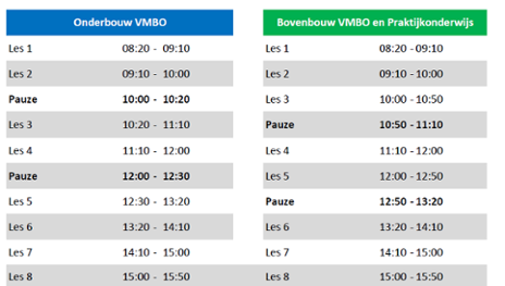 Leerlingen krijgen les volgens een bepaald rooster. De leerlingen hebben lessen van 50 minuten.